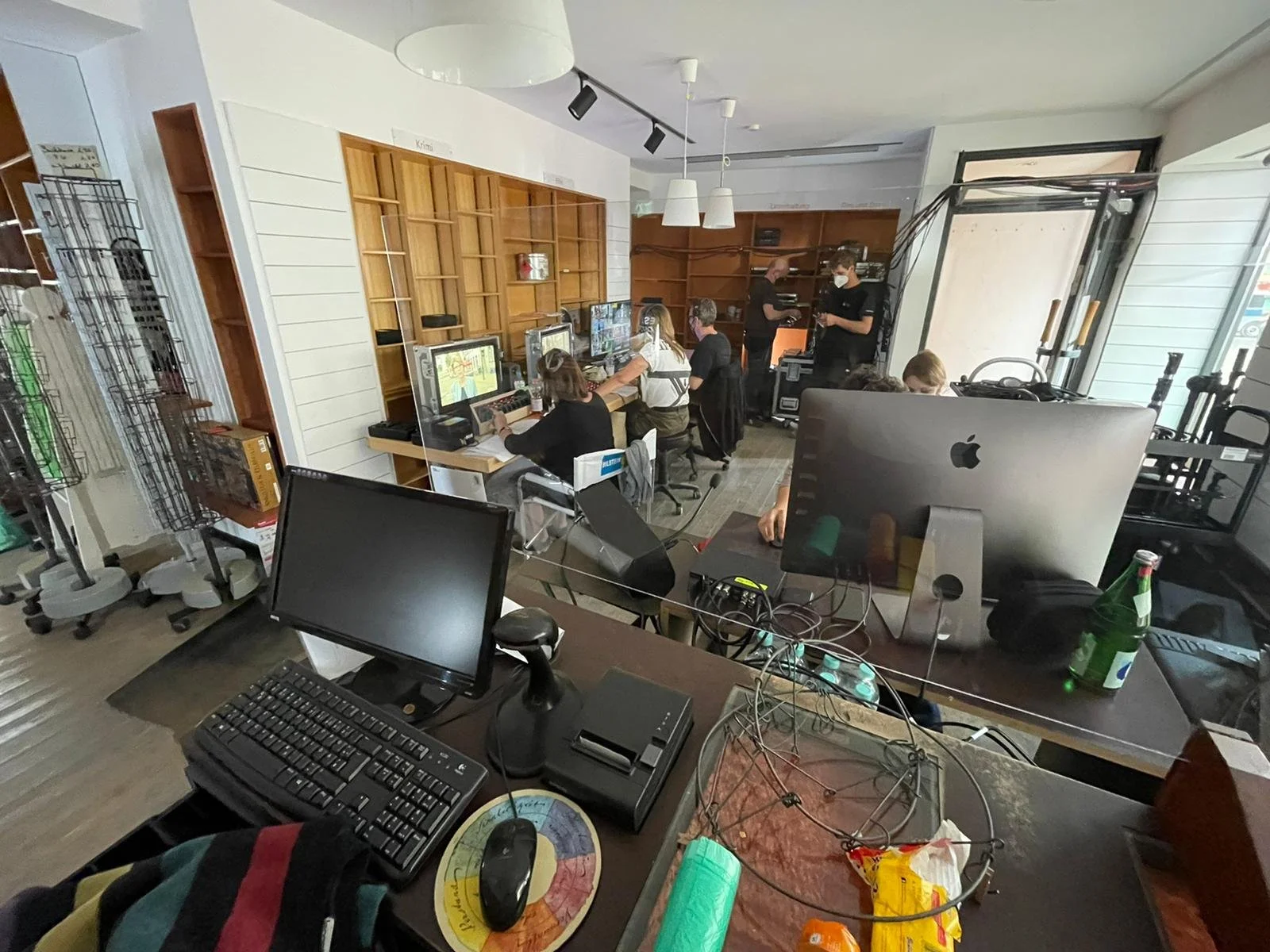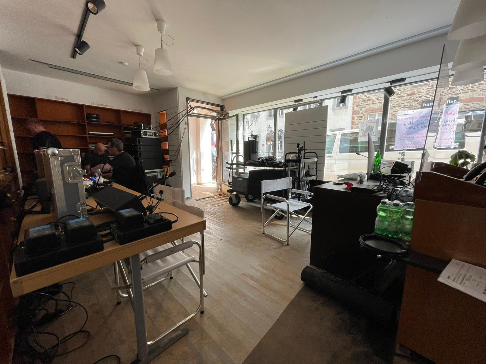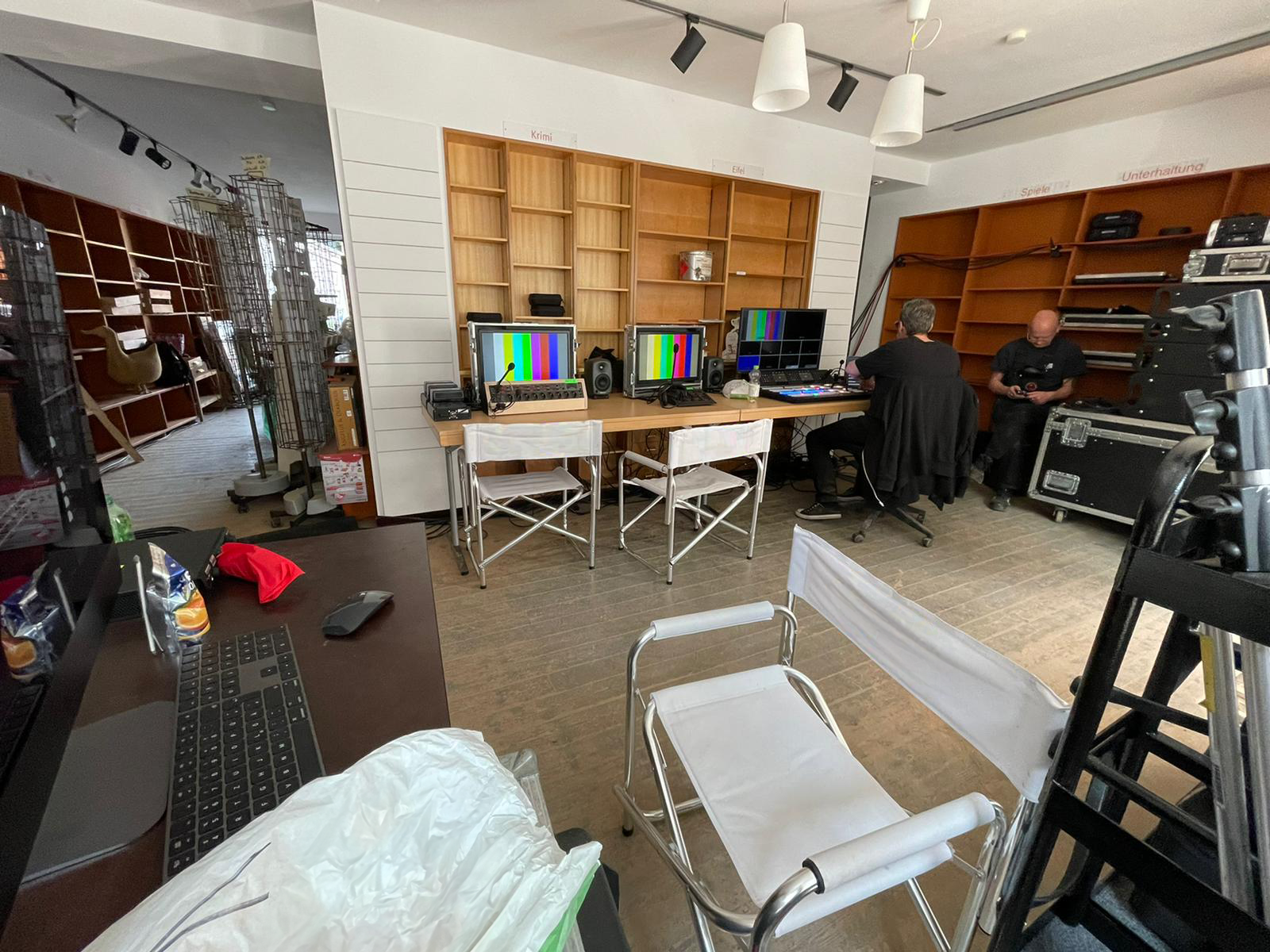 Wir errichteten in der Fußgängerzone ein vollständiges TV-Setting und bauten die Regie in der beschädigten Bücherei als temporären Produktionsstandort auf. Neben Multikamera-Technik kamen zahlreiche Funkstrecken sowie Licht- und Tontechnik zum Einsatz, um einen regulären Sendebetrieb zu gewährleisten. Da vor Ort keine stabile Internetanbindung verfügbar war, stellten wir mit unserer eigenen SNG-Einheit den Satelliten-Uplink sicher und übertrugen das Sendesignal direkt in die WDR-Sendezentrale. So entstand unter extremen Bedingungen eine sendefähige Live-Produktion, die in Qualität und Ablauf einer regulären Studioproduktion entsprach.